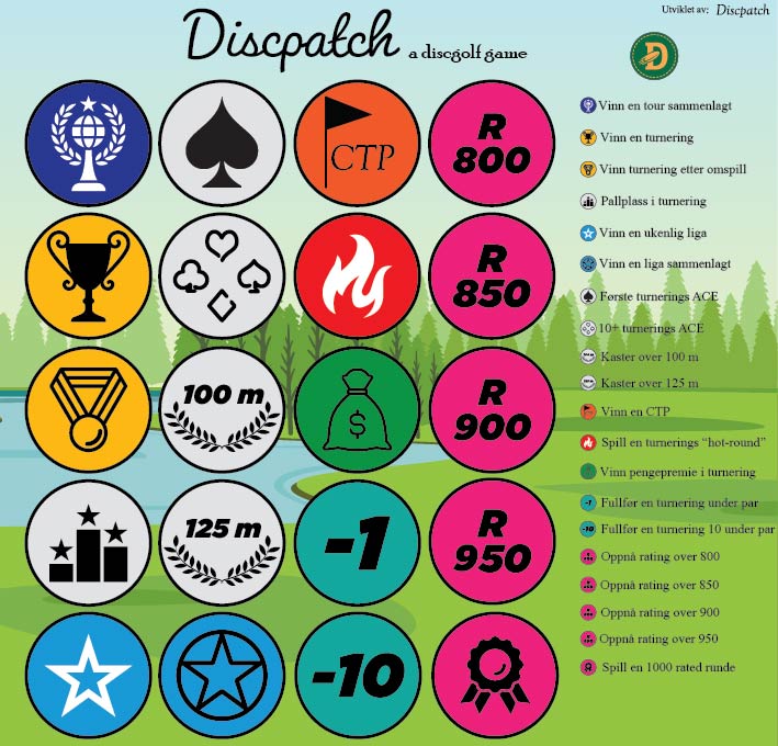 Prestasjonsmerkene som viser frem diverse bragder du har oppnådd på discgolfbanen.